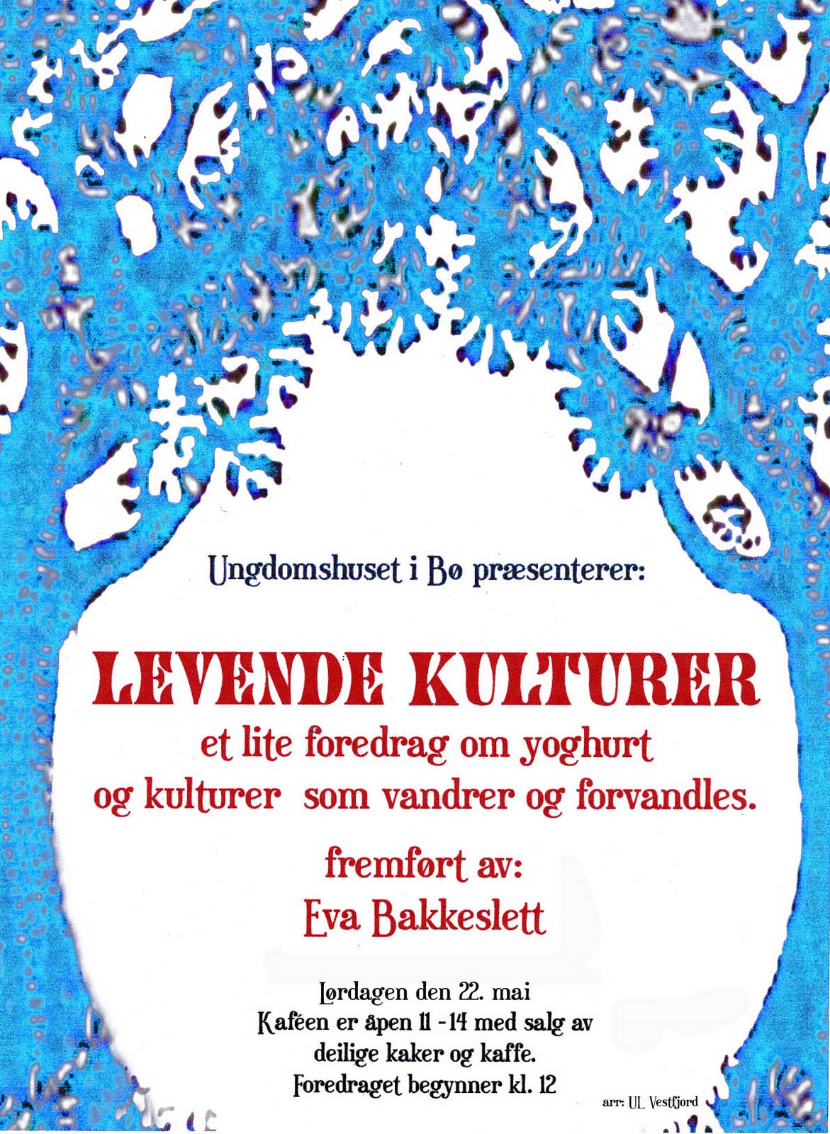 “Levende Kulturer – et lite foredrag om yoghurt og kulturer som vandrer og forvandles” på Ungdomshuset i Bø på Engeløya Lørdag den 22. mai kl. 12. Kaféen har åpen 11-14.